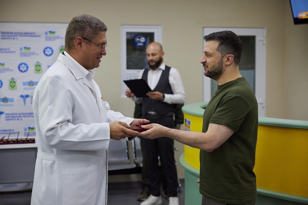 Pictures from President Zelensky's visit to a hospital in #Mykolaiv, in southeast #Ukraine, on the frontline with the #Russian-occupied zone. Zelensky celebrated the "heroic" contributions of doctors and medical staff to the country's war effort.