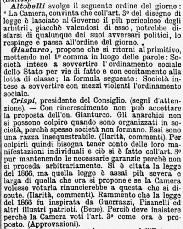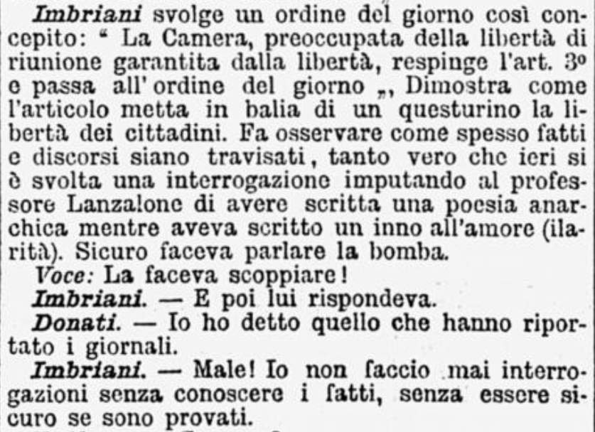 In quell’11 luglio 1894, in una Camera semideserta, l’approvazione dell’articolo 3 della nuova legge di pubblica sicurezza era fondamentale per il governo presieduto dal siciliano Francesco Crispi.