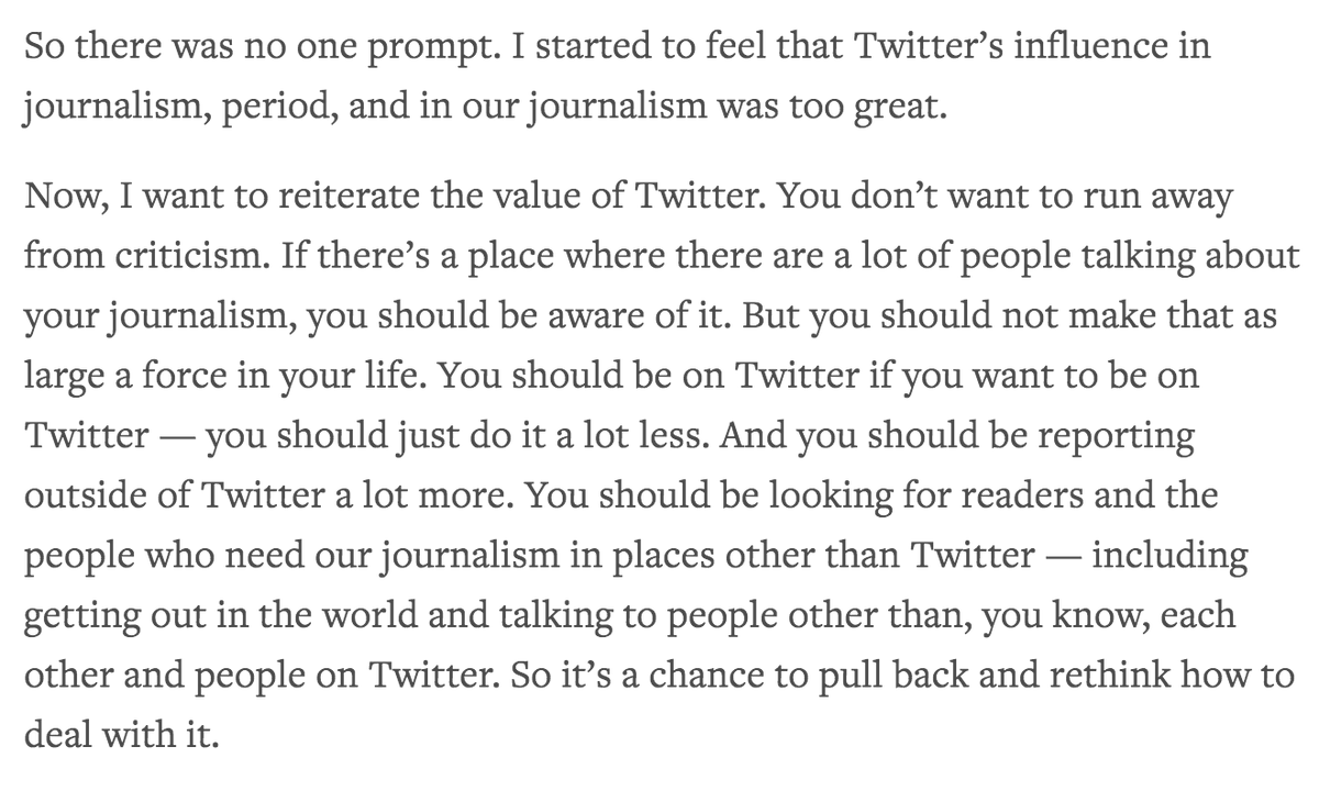 This the heart of Baquet's reasoning: Twitter's influence on Times journalists has become too great. niemanlab.org/2022/04/the-ne…