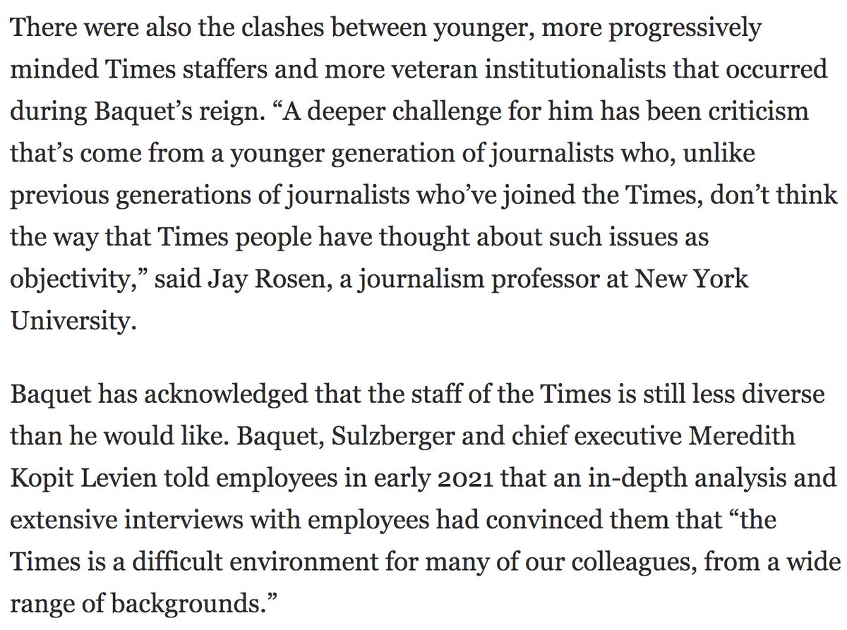The Post asked me about Dean Baquet's legacy. I said he gets credit for steering the Times to digital excellence and subscription success, for adding investigative capacity, for enlarging newsroom employment. All major victories. washingtonpost.com/media/2022/04/… Demerits: next slide. 1/2