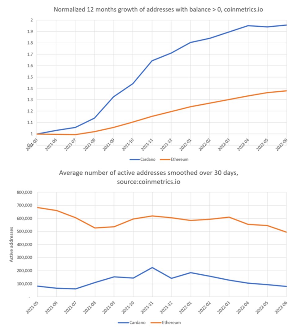 In the last 12 months, the number of Cardano addresses has increased by 96% (3.7M) while on Ethereum it has increased by 38% (83.1M). The number of active addresses on Cardano has decreased by 4% (78.8K) while on Ethereum it has decreased by 28% (495.5k).
