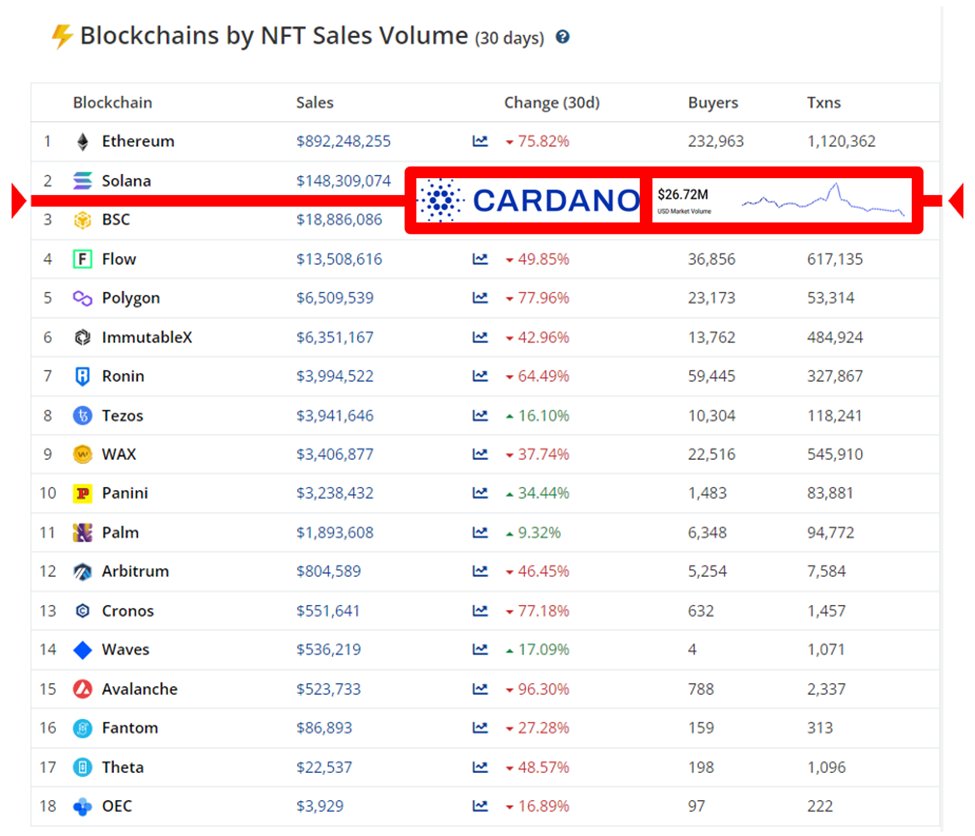 Cardano is now the third largest NFT market, all chains combined. There is still a lot of room to grow to reach Solana and Ethereum.