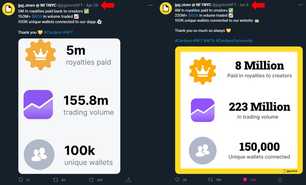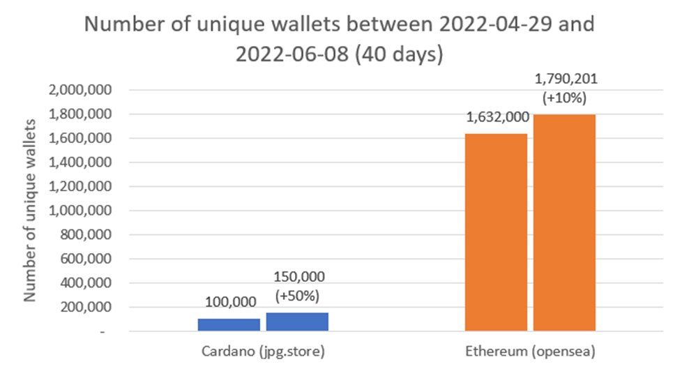From April 29th to June 8th, Cardano’s biggest marketplace reported that the number of unique wallets connected to its website increased by 50% in 40 days while Opensea increased by only 10%.
