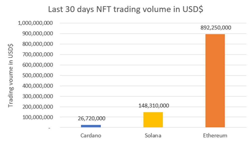 Yet, ETH NFT trading volume is 33.4x higher than ADA...