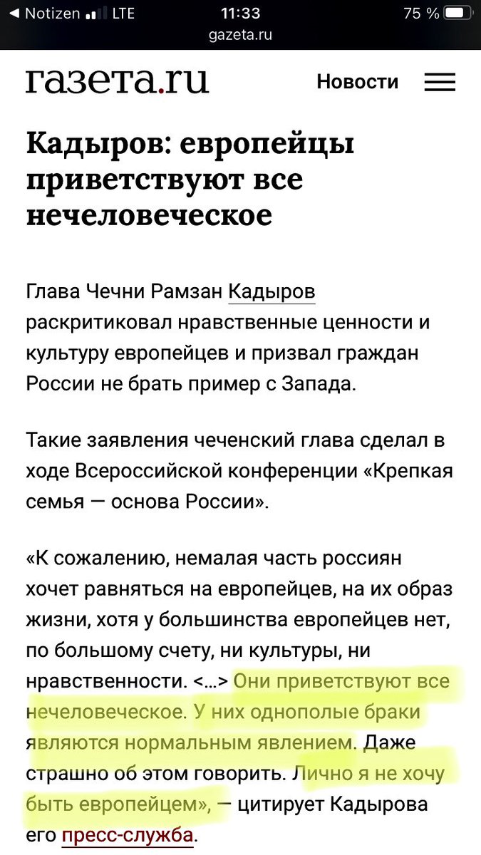 Das Narrativ ist: Bei uns in Russland ist alles normal, die im Westen spinnen total. 2013 sagte Tschetscheniens Diktator Kadyrow über den Westen: „Sie begrüßen alles Unmenschliche (…) Gleichgeschlechtliche Ehen sind normal. (…) Ich persönlich möchte kein Europäer sein“. 5/10