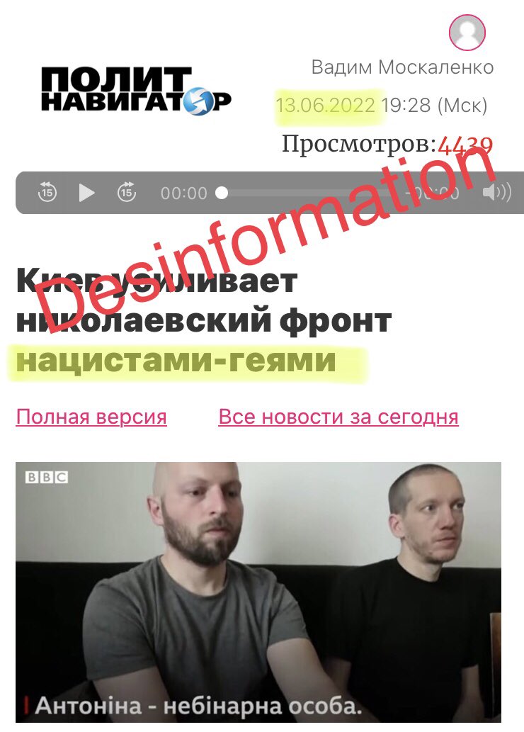 Queerfeindlichkeit wird auch benutzt, um gegen die Ukraine zu hetzen. Schon 2021 behauptete eine „Rossija-1“-Moderatorin, Selenskyj würde auf Befehl von Joe Biden „Homosexualisten“ an die Front schicken (Bild 1). Kürzlich gab es erneut eine ähnliche Schlagzeile (Bild 2). 7/10