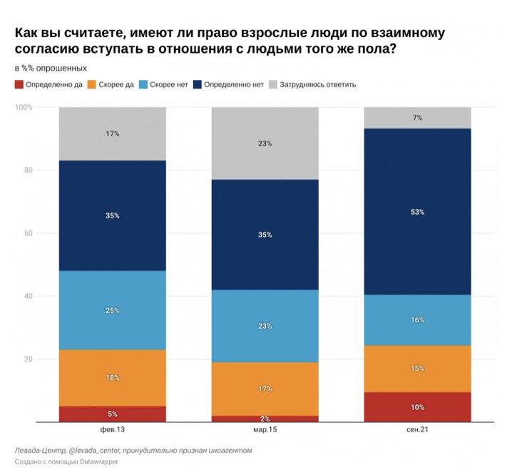 Während Putins Amtszeit ist die Queerfeindlichkeit in Russland gewachsen. 2013 waren 60% gegen gleichgeschlechtliche Beziehungen. 2021 waren es schon 69%. 9/10