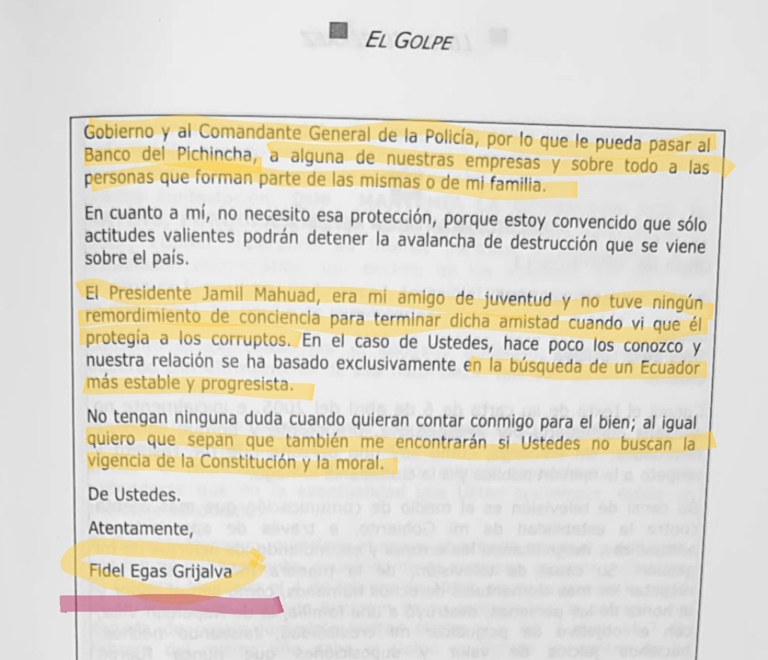 15 días antes de su derrocamiento un 21 de abril de 2005, @LucioGutierrez3 recibió una carta del dueño del Banco Pichincha #FidelEgas, quien reclamó airadamente al presidente, al ministro de gobierno y al comandante de la policía...