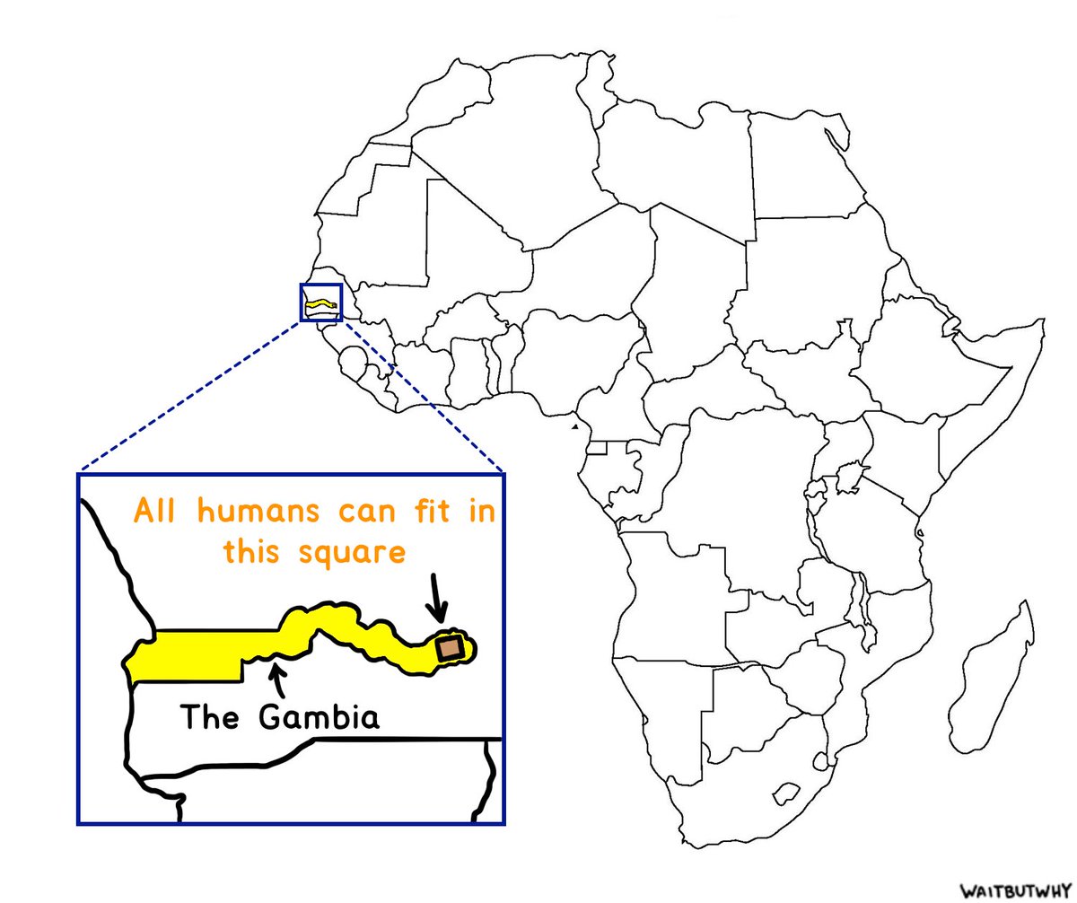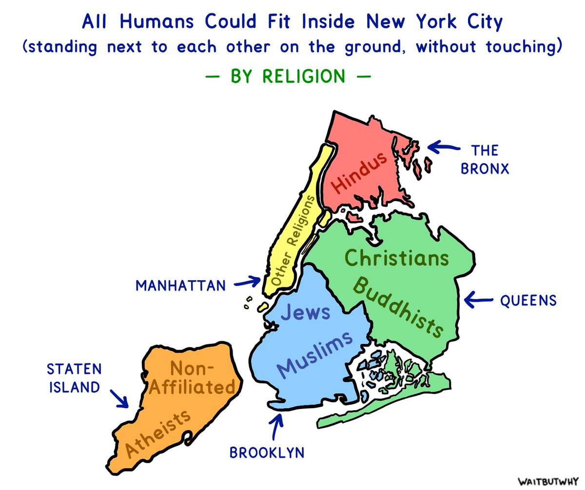 In case we're ever in a bind, I figured it out and all humans can fit snugly inside New York City, all standing on the ground next to each other without touching each other. We can organize ourselves by geographical region: