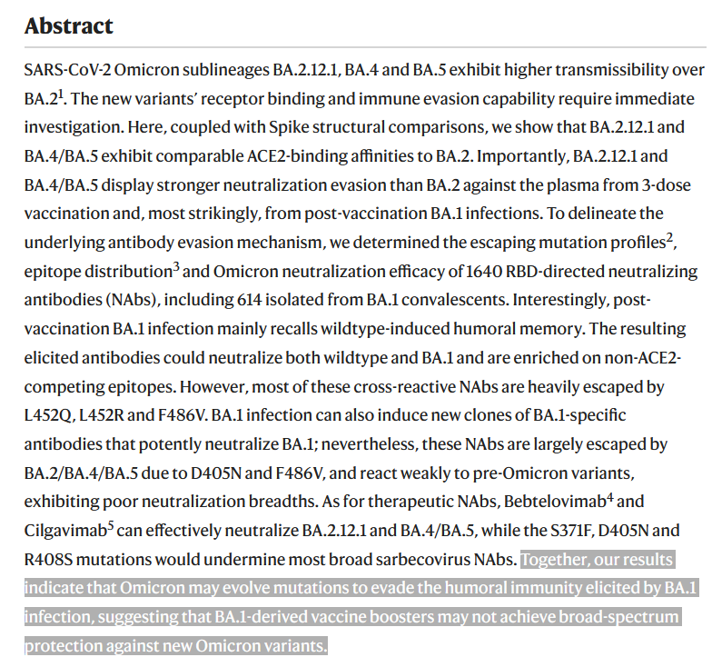 D'après une étude parue récemment dans @nature, l'échappement immunitaire des sous-variants d'#Omicron BA.2.12.1 et BA.4/5 est tellement important qu'il risque de remettre en question l'efficacité du rappel spécifique de vaccin contre BA.1.