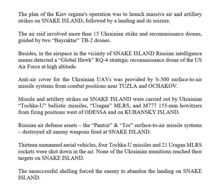 6. El Ministerio de Defensa de Rusia a informado que ayer se repelió un ataque a la isla de la Serpiente y como represalia, destruyó un montón de material, entre ellos 14 drones y dicen que ya van 1292😁.