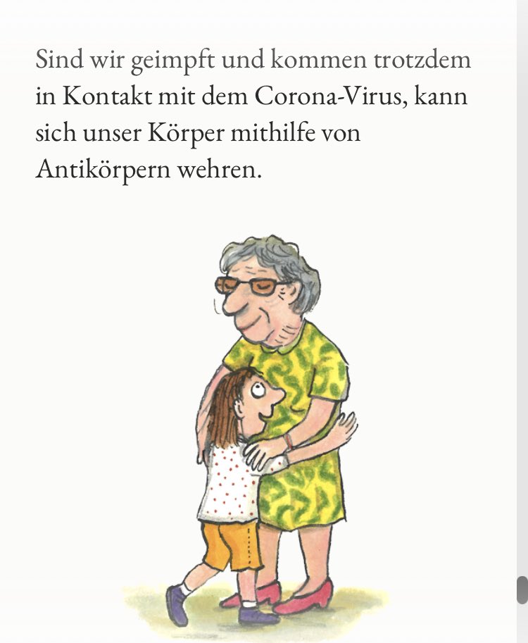 Eine Kinderbuch-Geschichte, die im Februar 2022 (sic!) veröffentlicht wurde (Omicron-Zeit), wirbt bei Kindern noch für Abstand halten, Zuhause bleiben, und suggeriert, dass man nach der Impfung wieder die Oma umarmen darf.