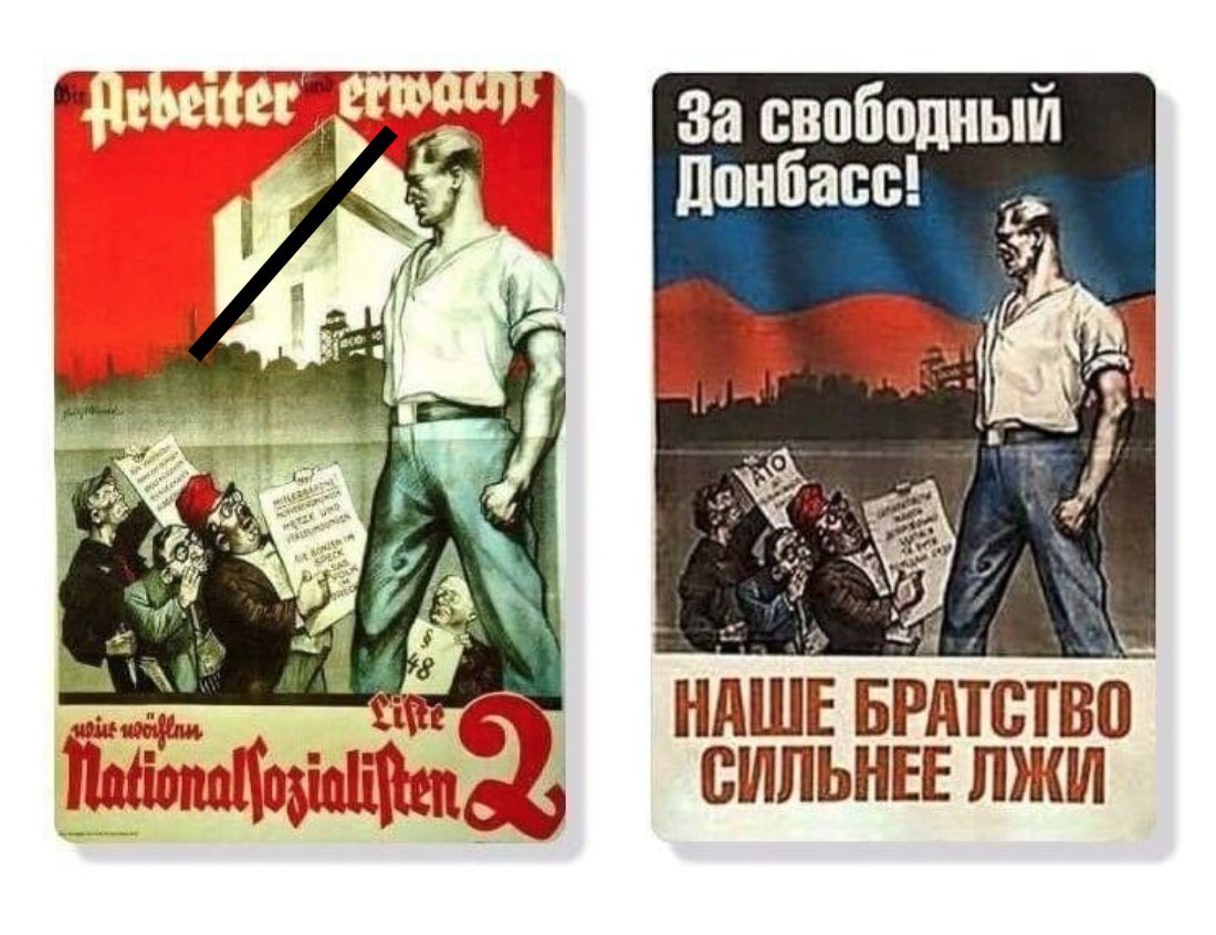 The modern Russian poster "Our brotherhood is stronger than (their) lie" is copies a Nazi poster from early 1930s, calling to vote for the National-Socialist Workers' Party. Instead of France and Jews, who are opposing the German worker, Ukrainian Jews are "threatening" Donbas /2