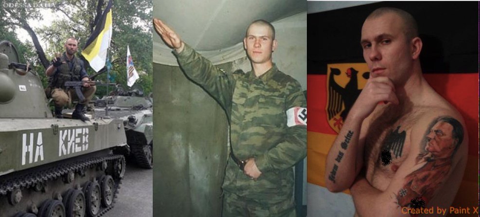 Or here: Alexey Milchakov, a Russian soldier who fought in Ukraine in a Nazi unit "Rusich". Look also at "Rusich" emblems, which clearly play with Swastika and "Sieg-Rune" motives: