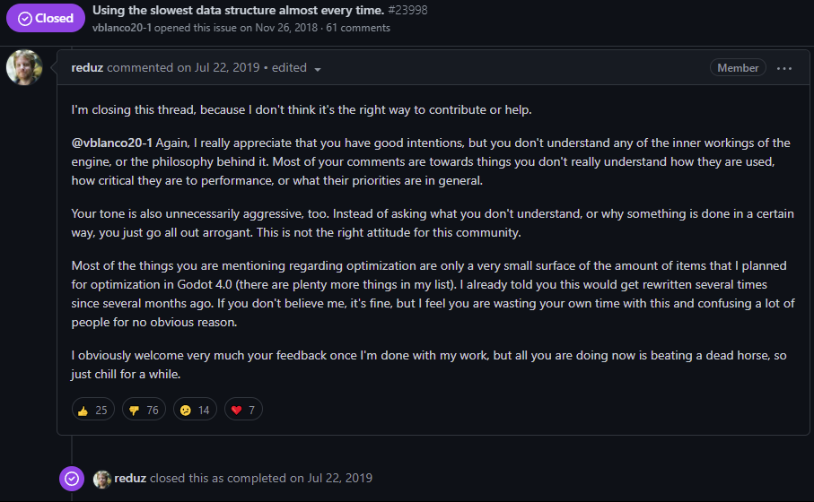 Hopefully, the above shows you a clear contradiction in what @reduzio says to the public versus his actions. Mind you, this is just an example, and a little bit of research can confirm that these contradictions do exist and are typical in Godot community.