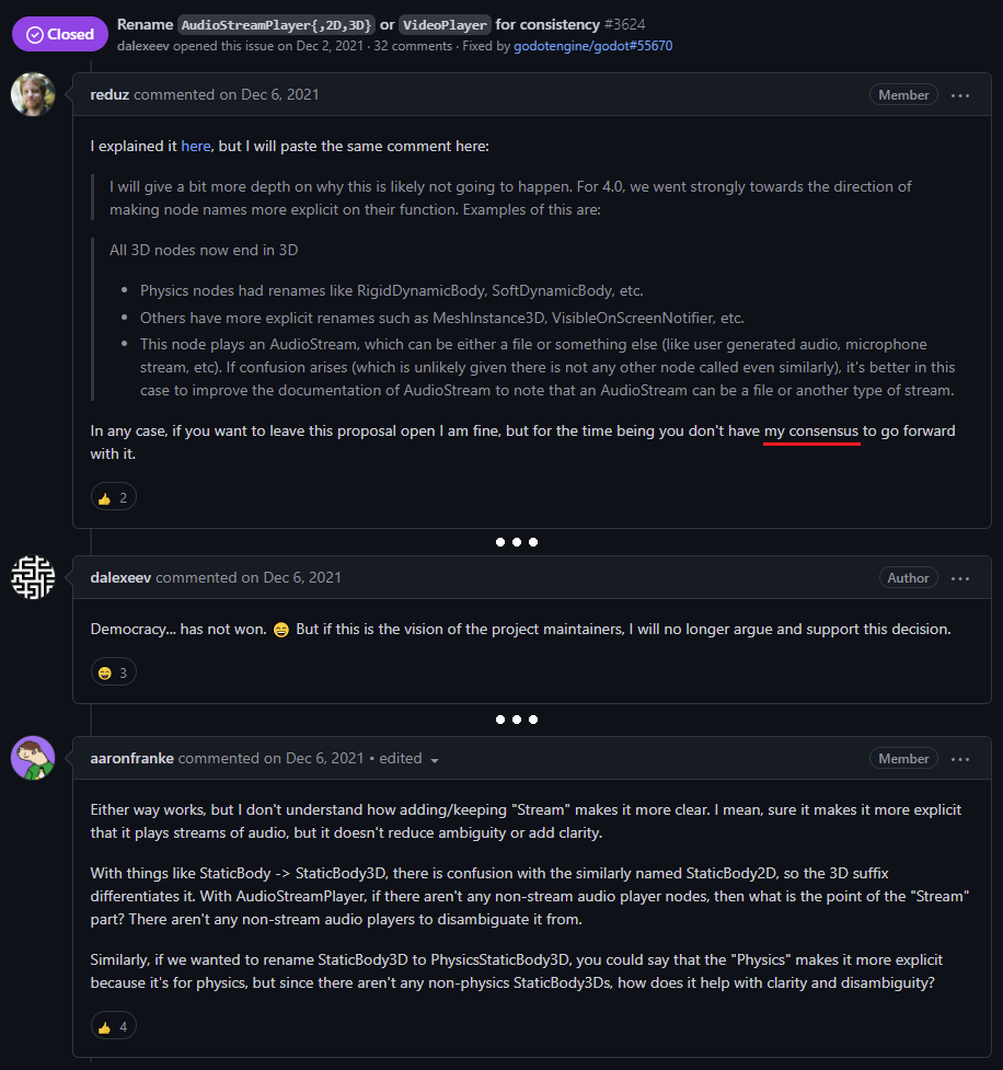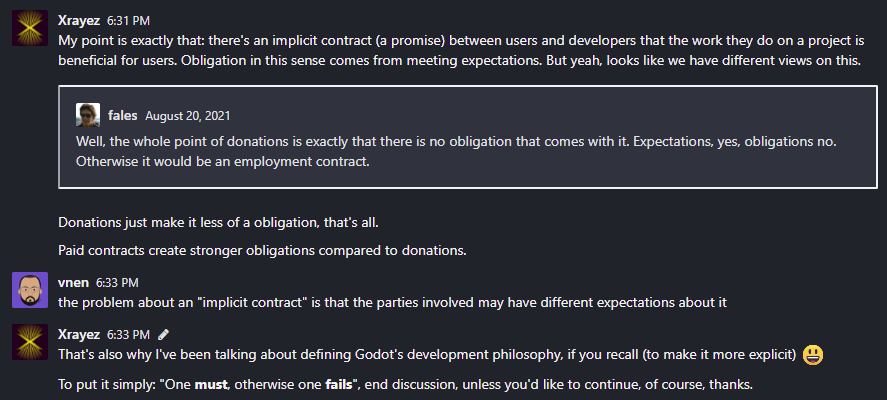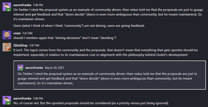 In other discussion, one member said that "he's in favor of opinionated decision making process with few decision makers", and Godot's Discord admin saying "Godot should strive to be less community-driven":