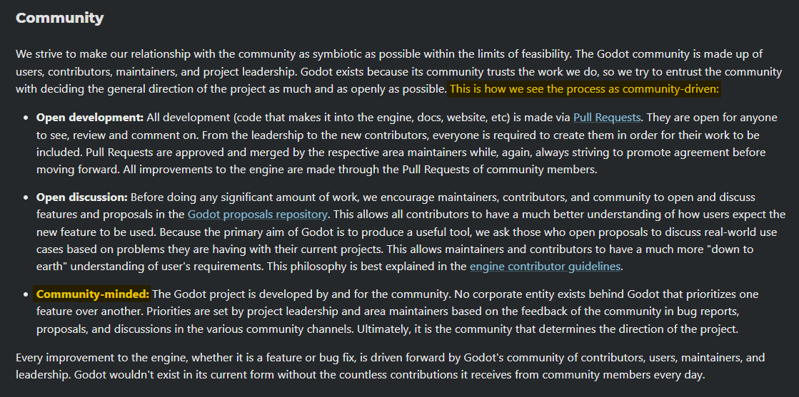 After my discussions with Godot leadership you see above, they have set up a governance model page. Unfortunately, it took 7 years after Godot got open-sourced. You'll see their own definition of what they mean by "community-driven" there:
