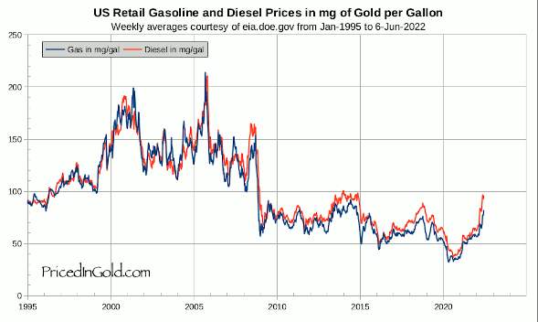 Important to remember: The price of gas isn’t going up so much as the price of the dollar is going down. When priced in gold, gas is about the same as 1995 (≈80 mg/gal today vs. ≈90mg/gal then). See chart below. 1/2
