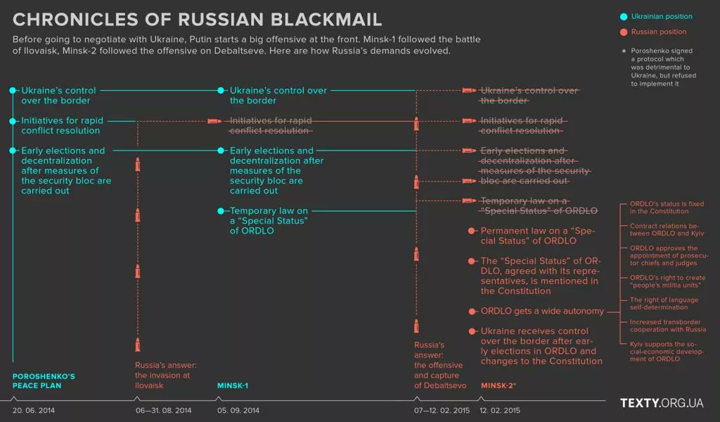 Ukraine was pushed into signing the Minsk-1 "peace deal" which was aimed not so much at peace as freezing the conflict. But this was not enough for Russia, so after another open invasion in Feb 2015, Ukraine's post-Euromaidan president Poroshenko was forced to sign Minsk-2👇