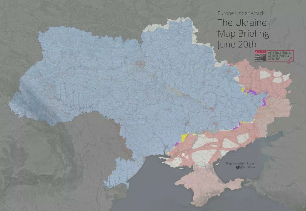 Changes on the Ukrainian frontline in the last month. Russian gains are in purple, Ukrainian gains in yellow.