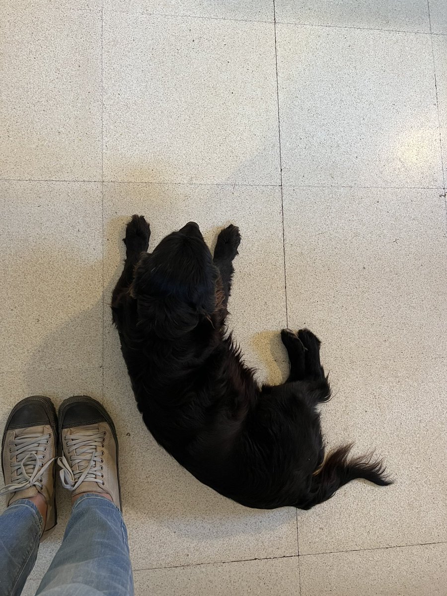 El Pocket no sabe que se llama El Pocket. Pero viene cuando me escucha y busca que le haga mimos, ya se pone panza arriba y duerme despatarrado, un perro callejero tarda más tiempo en tener esa confianza.