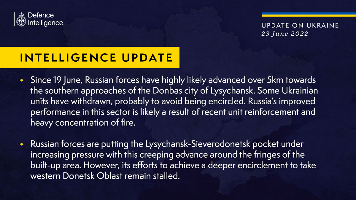 Since 19 June, Russian forces have highly likely advanced over 5km towards the southern approaches of the Donbas city of Lysychansk.