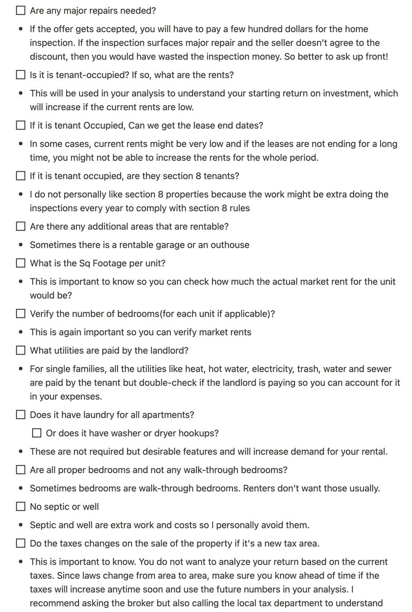 I'll reach out to the broker to get inputs for my financial model and to do some qualitative analysis(See a portion of my list in the pic)