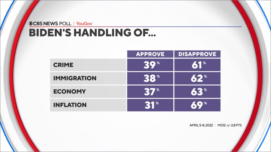 NEW: @POTUS Biden’s overall job approval is 42%, down one point from last month; it's been hovering in the low 40s for months now, and that tick down does mark its lowest point yet. He is underwater on his handling of crime, immigration, economy and inflation.