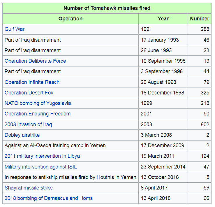 28. A modo de curiosidad, no de comparativa, esta es una tabla donde se registran el número de misiles de crucero Tomahawk lanzado en diferentes conflictos donde ha intervenido EEUU.