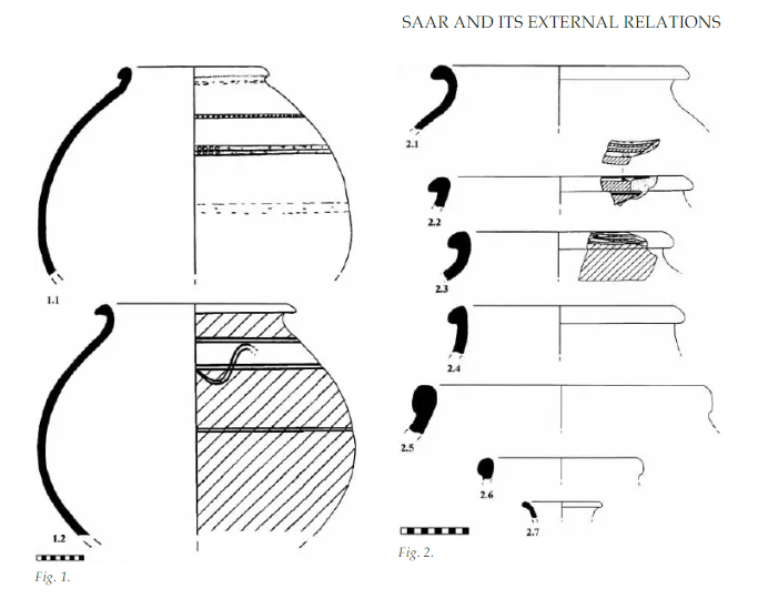 SAAR pottery corresponds to material associated with the later phases of the Saurashtra Harappan, with the best parallels from Rojdi Phase C (2000–1700 BC), LothalPhase B (2000–1800 BC), and Rangpur Period II B-C (1900–1500 BC)