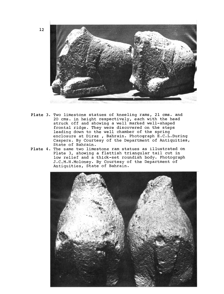 Two limestone statues of kneeling rams, with the head struck off and showing a well marked well-shaped frontal ridge. They were discovered on the steps leading down to the well chamber of the spring enclosure at Diraz, Bahrain