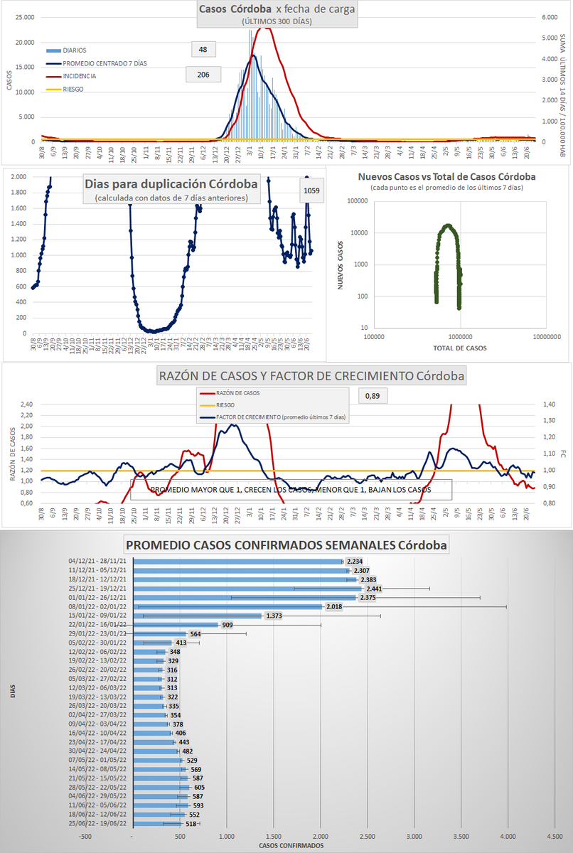 Casos Diarios, Prom últimos 7 días, SUMA de últimos 14 días / 100.000 habitantes. Días de Duplicación, Log-Log Nuevos vs Total de Casos.