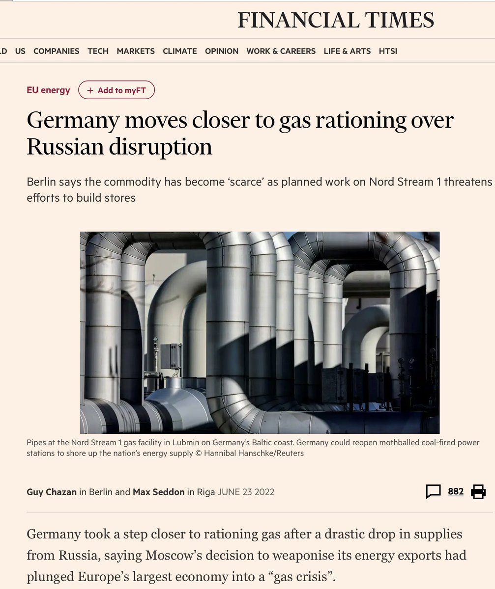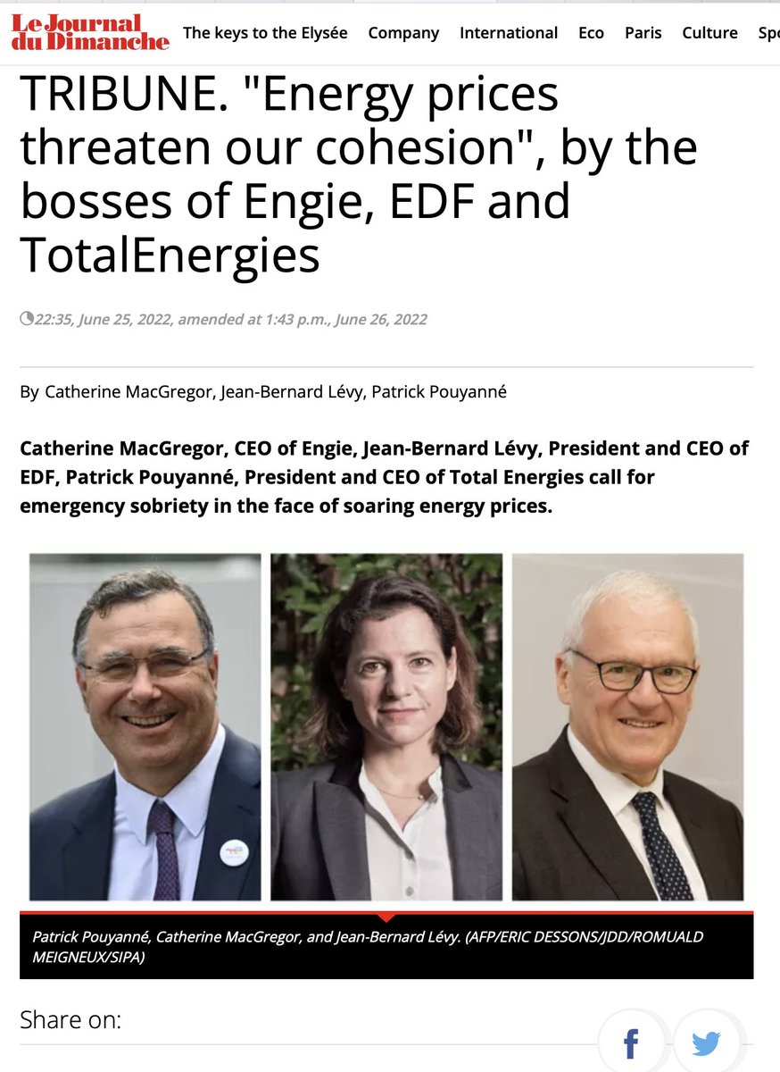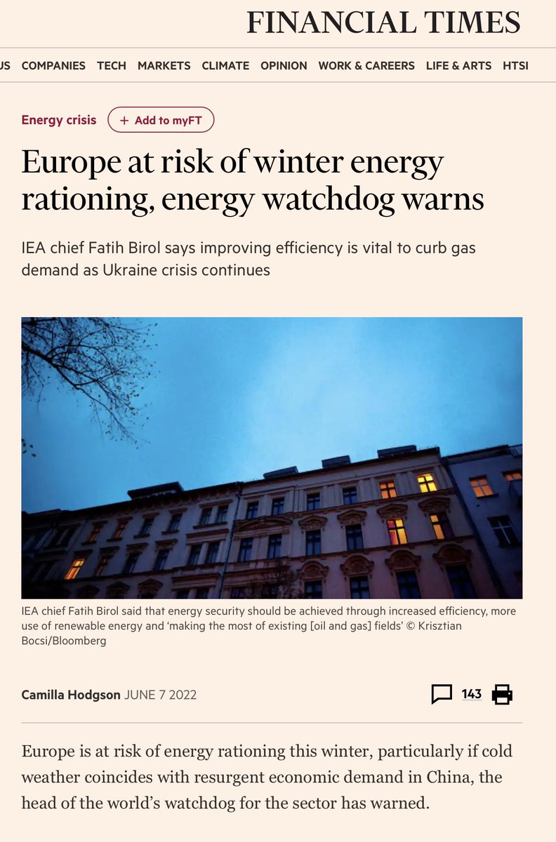 Energy experts have been warning of energy rationing for weeks. IEA warned of rationing 3 weeks ago. Germany moved closer to rationing nat gas last week after Russia curtailed supplies. And today, the heads of France's 3 biggest energy companies called for voluntary rationing.