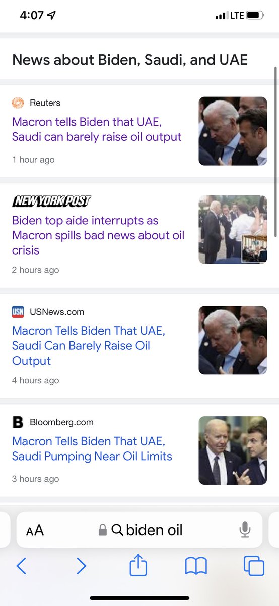 Biden was counting on Arab nations to produce more oil but a few hours ago French President Macron was overheard telling Biden that the United Arab Emirates is at max capacity & the Saudis can’t produce much more. It appears to be a direct appeal to Biden to produce more oil.