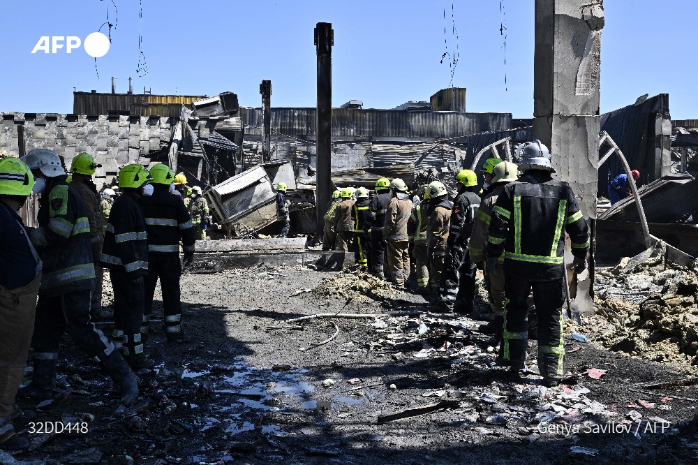 Images published by the State Emergency Service of Ukraine show rescue workers clearing rubble at the "Amstor" shopping centre in the Ukrainian city of Kremenchuk. The mall was hit by a Russian missile strike