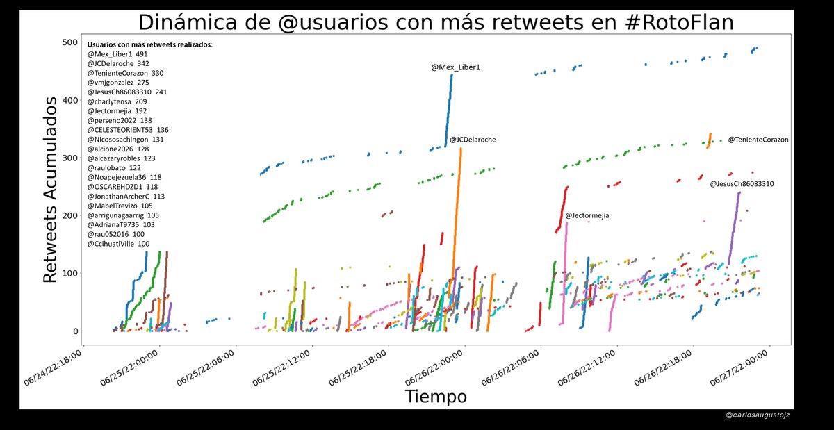 Cuando se realiza un retweet se deja un rastro digital, si se realizan varios rt´s en muy poco tiempo, se observará como una línea vertical en la siguiente gráfica, donde se pueden ver decenas de cuentas con una mayor actividad de retuiteo(4/5).