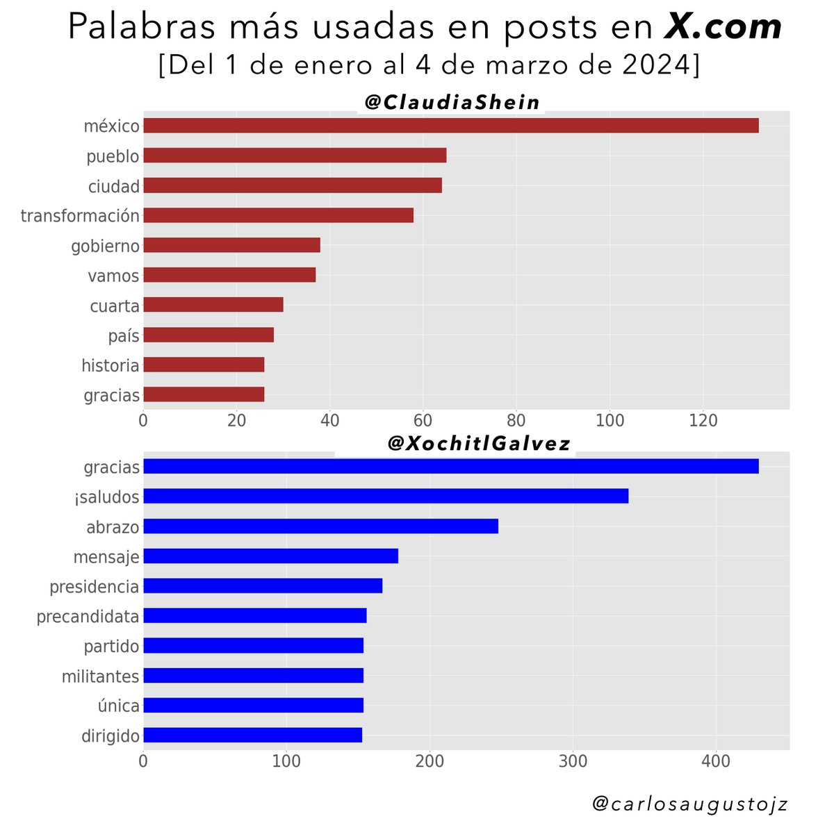 El análisis de las palabras de mayor frecuencia muestra que los posts de la Dra. @ClaudiaShein se han enfocado en “México”, “Pueblo”, “Ciudad” y “Transformación”, mientras que, Xóchitl Gálvez en dar las gracias, saludos y abrazos (3/7).