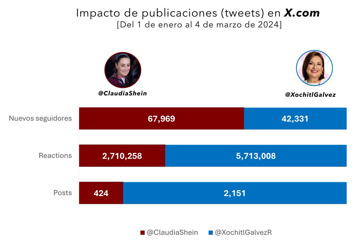 Un análisis de las publicaciones (Tweets) de la Dra. @ClaudiaShein y @XochitlGalvez mostró como la candidata de la derecha ha emitido más tweets pero, la representante de la #4T ha generado un mayor impacto en nuevos seguidores (1/7).
