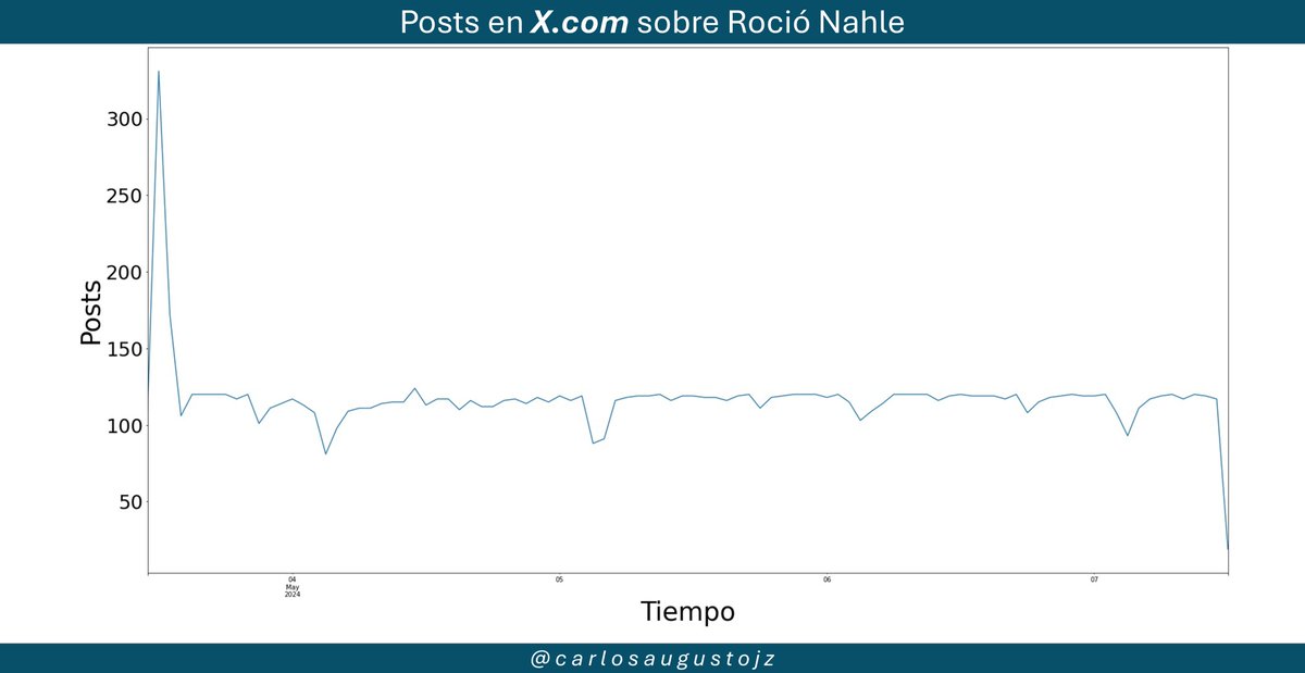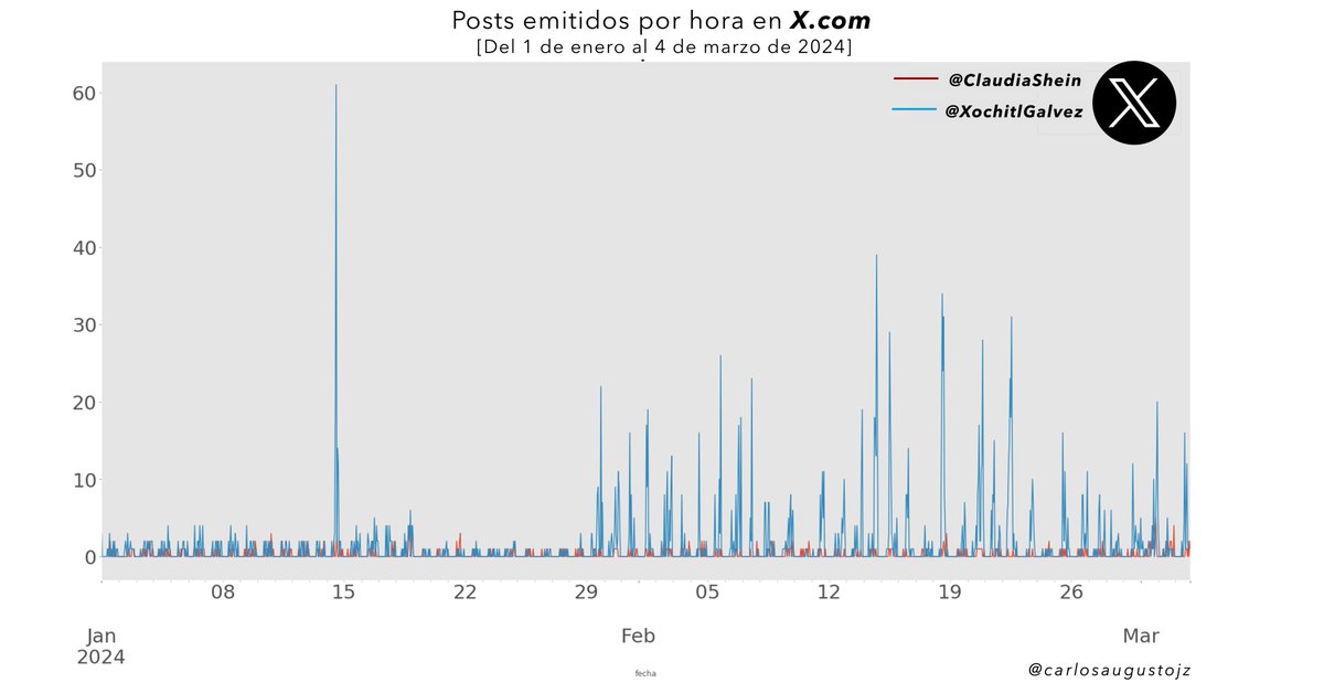 La dinámica de posteo dejar ver que, Xóchitl Gálvez ha rebasado los 25 posts (tweets) por hora y es notable como a partir del 30 de enero, surgió un patrón de posteo similar a los tweets de los recientes hashtags anti-#AMLO (2/7).