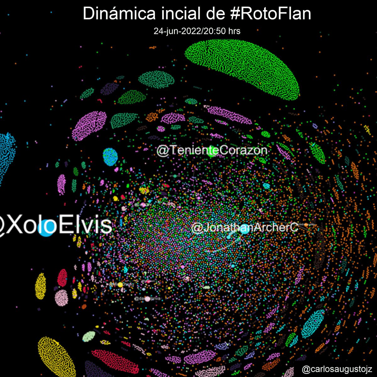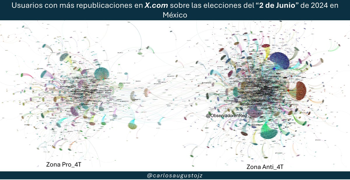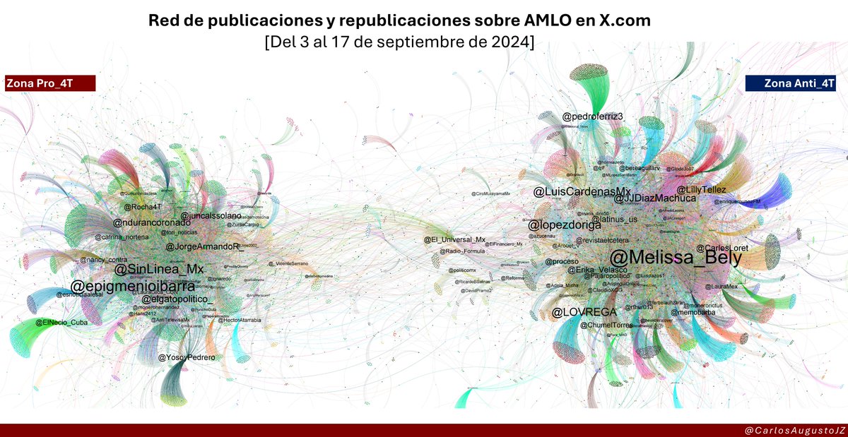 Las interacciones alrededor del presidente @LopezObrador_ generan comúnmente dos zonas, una de apoyo y otra en contra. Es notable como la zona AntiAMLO tiene una estructura organizada en comunidades de retuiteo masivo (3/6).