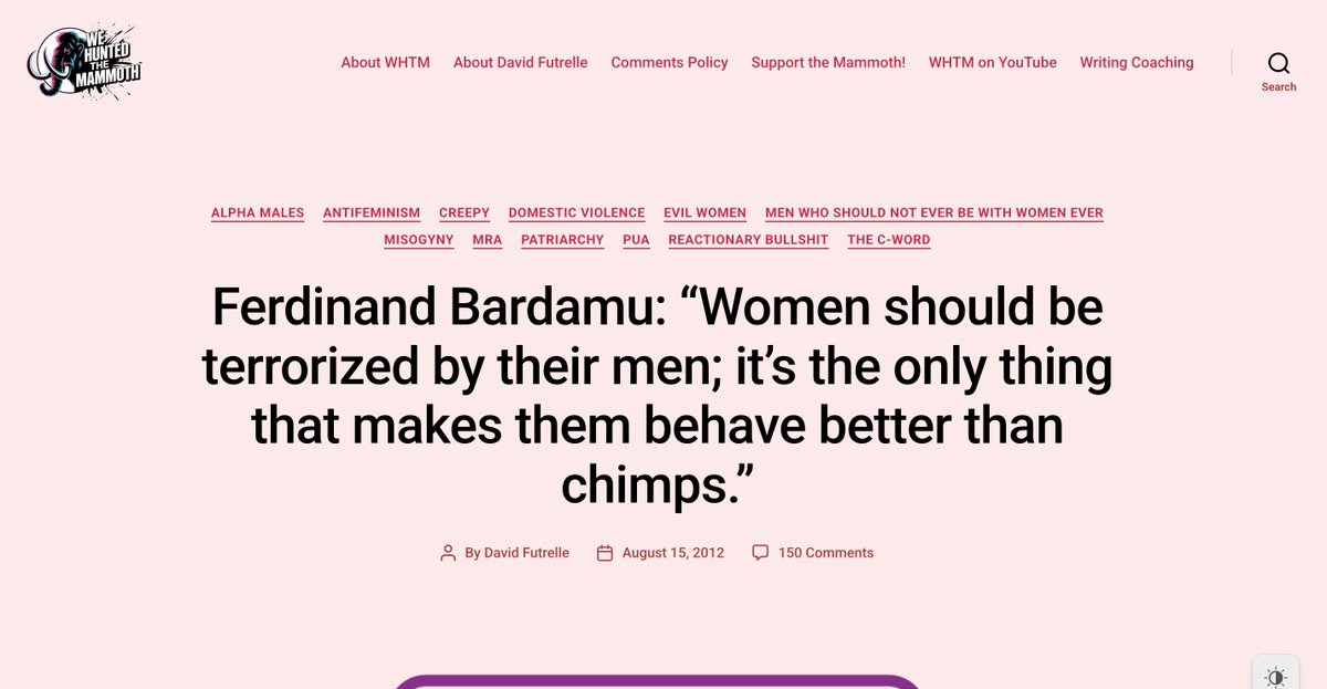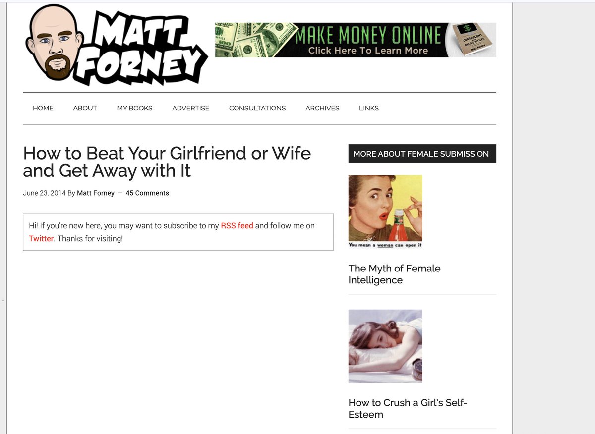 Meet Matt Forney who also goes by the name Ferdinand Bardamu is a white supremacist who hates women, teaches other men how to beat their wife/gf and get away with it. He believes women's genatilia is "an empt vessel, a hole, a void with no identity of its own" and is useless until "a man fills her with his essence". He also promotes r2pe, beating women to discipline them and believes all women need to be treated as women are "whores"!