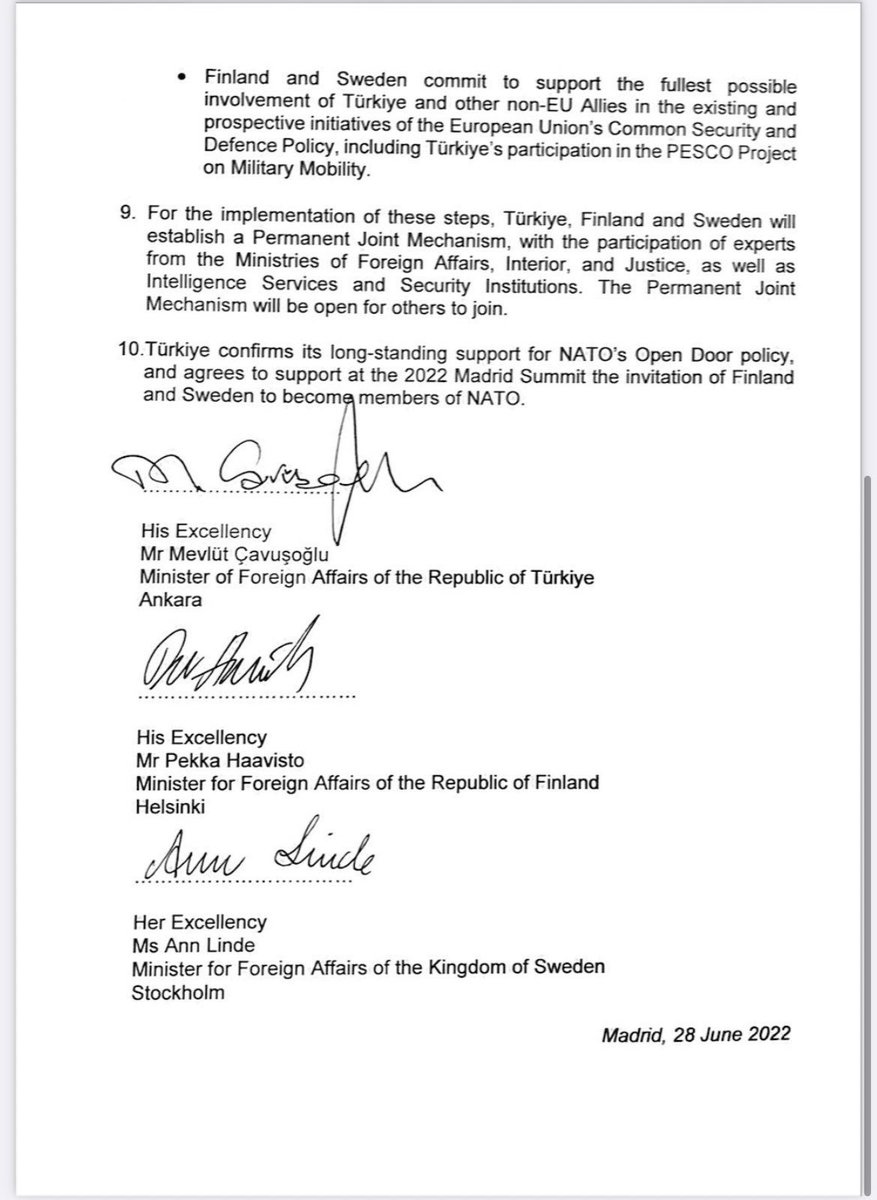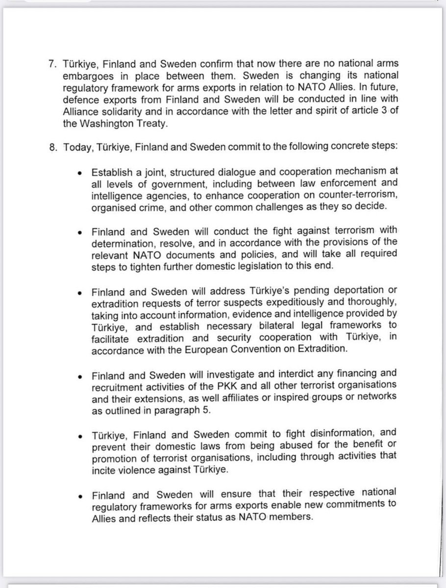 #Turkey has signed a memorandum with #Sweden and #Finland after talks at the #NATO summit in Madrid that set aside Ankara's objections to the two Scandinavian states joining the Alliance. The formal invitation will be issued on 29 June. news.sky.com/story/nato-tur…