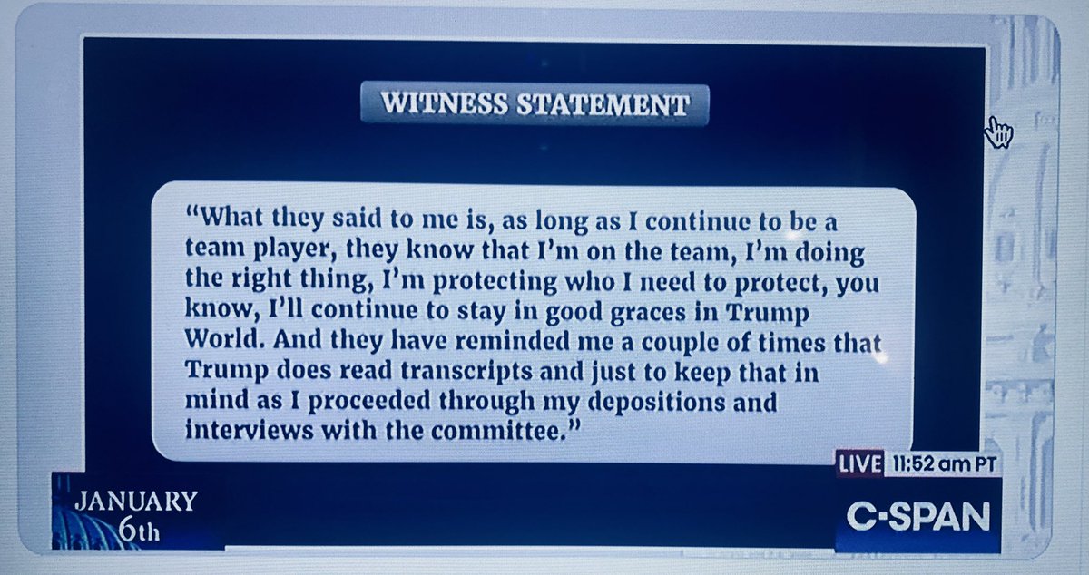Rep Cheney proceeds to show and read select passages from statements they’ve received from multiple unnamed witnesses who have said under oath that they have received threats from Trump intermediaries reminding them that Trump is watching the hearings and “reads the transcripts.”