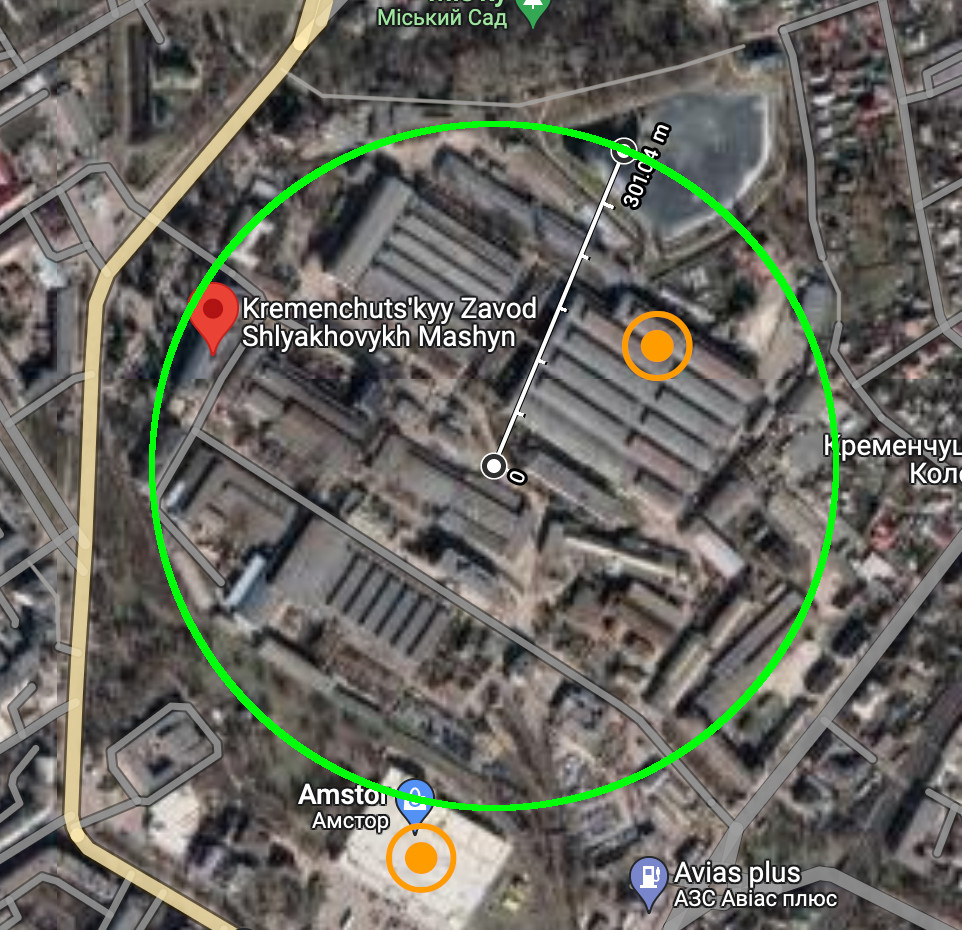 7/ Let's overlay the approximately 300m circular error probable (CEP) onto the plant, assuming that the aiming point is right in the middle of the complex. It covers the entire plant - but also the shopping mall.