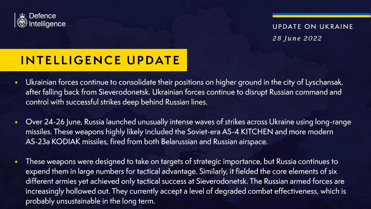 Ukrainian forces continue to consolidate their positions on higher ground in the city of Lyschansak, after falling back from Sieverodonetsk. Ukrainian forces continue to disrupt Russian command and control with successful strikes deep behind Russian lines.