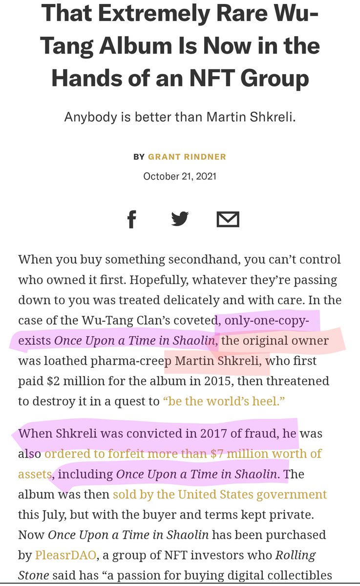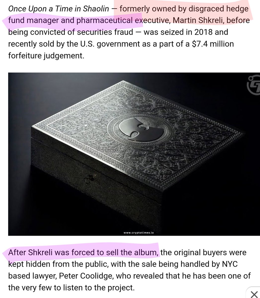 He owned The only Copy that Exists of Once Upon a Time in Shaolin(Wu-Tang Clan Albumn) before being convicted of Securities Fraud the U.S. Gov Seized the Albumn๐ดโโ ๏ธI think he wants it back ๐คฃ๐