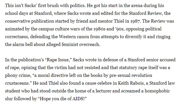 It turns out Thiel and Sacks have worked together since 1987, when they started the right-wing Stanford Review paper at Stanford.