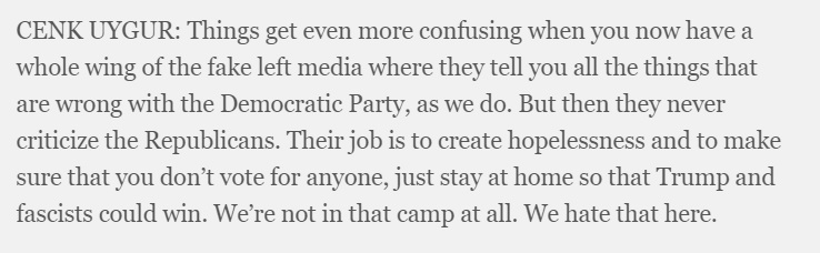 Cenk Uygur, whose tone changes from day-to-day, calls out the "fake left media" highlighted in this thread. I don't support some of the other things he said there, but I think we know who he's referring to with this statement. mediaite.com/radio/young-tu…