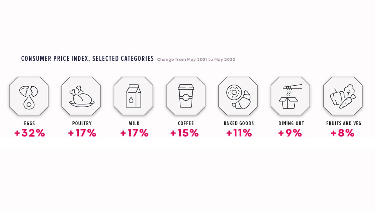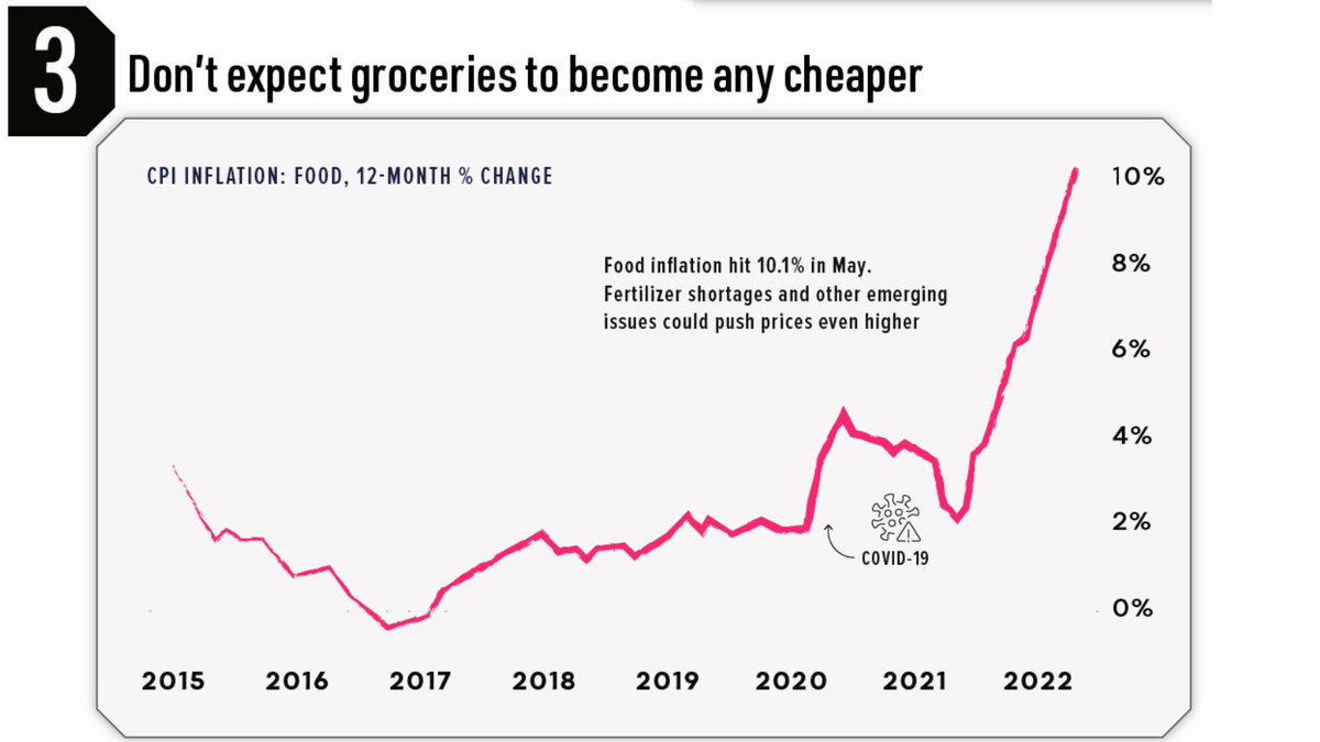 Le tableau suivant présente l'inflation des aliments au cours des trois dernières années, ainsi que la variation en pourcentage sur les 12 derniers mois.