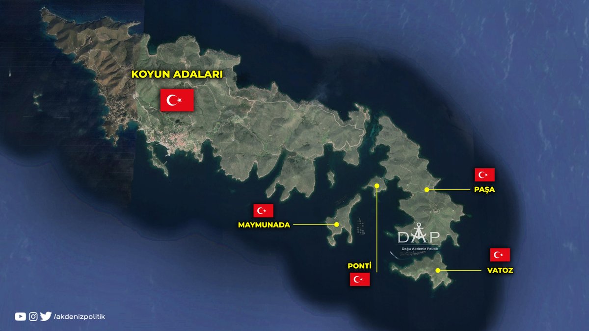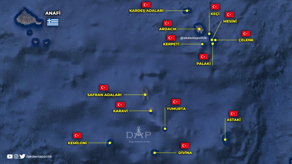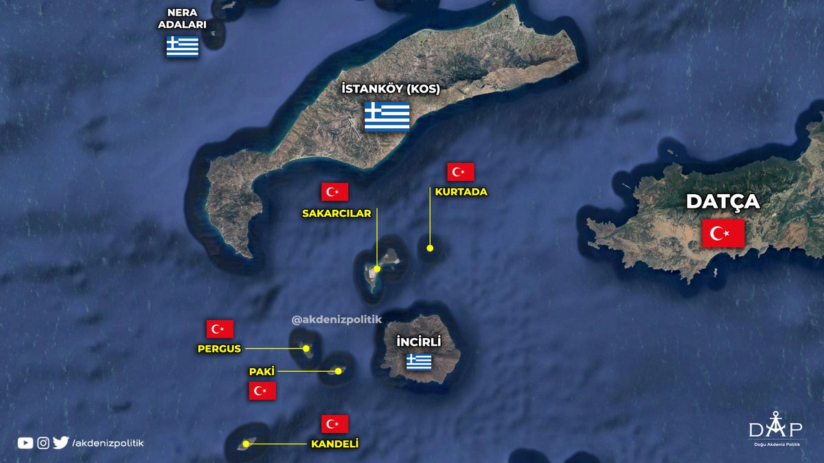 📌Adalar Denizi'nde, 1923 Lozan ve 1947 Paris Antlaşmaları dışında Egemenliği Yunanistan'a Devredilmeyen Ada, Adacık ve Kayalıklar (EGAYDAAK) harita üzerinde belirtilmiş olup, konumları tespit edilerek tweet dizisindeki haritalarda gösterilmiştir.